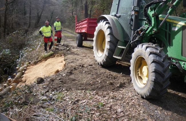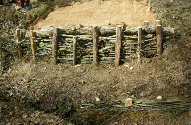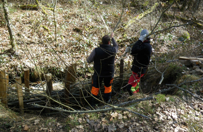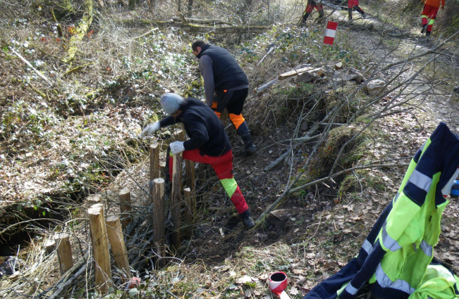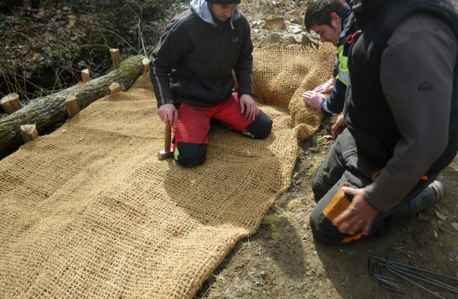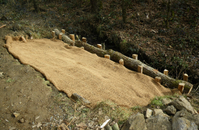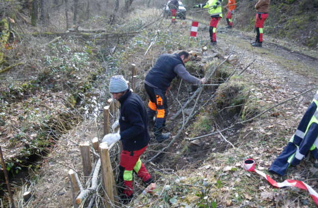 Une équipe est donc intervenue en début du mois de mars 2022 pour fixer le bord du chemin par des techniques respectueuses de l’environnement. En effet, il s’agit de maintenir le terrain avec une barrière faite en bois et solidement fixée par des piquets. Ensuite on implante des bouts de saules dans le terrain, le tout est recouvert par une toile. Les saules vont raciner et s’implanter ce qui maintiendra le talus .
